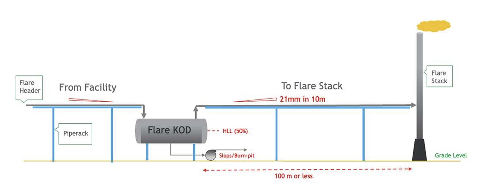 API 521 specifies a minimum slope requirement of 21mm in 10m (0.25 inches per 10 feet) for all flare laterals and headers, directed toward the FKOD. In practice, maintaining this slope across a large facility is more challenging than it appears: