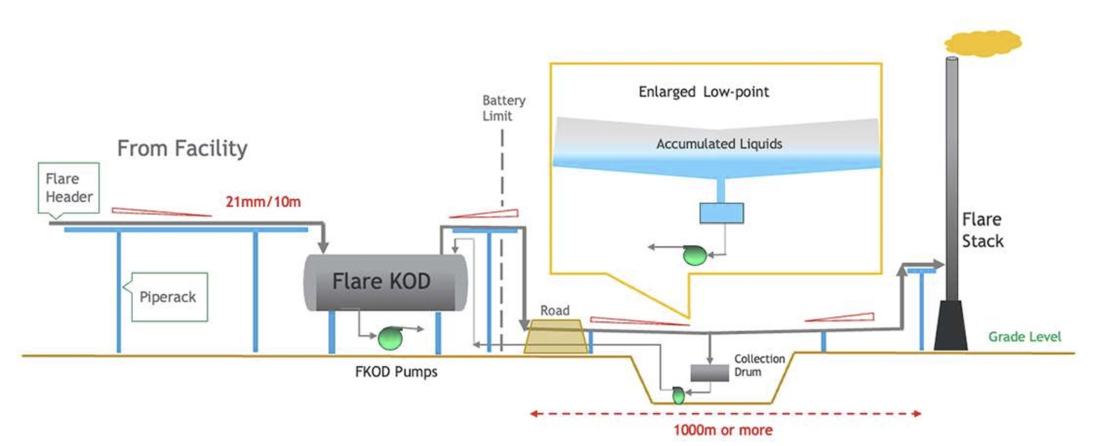 - Brownfield facilities where the flare stack was added or relocated after the KO drum was already installed